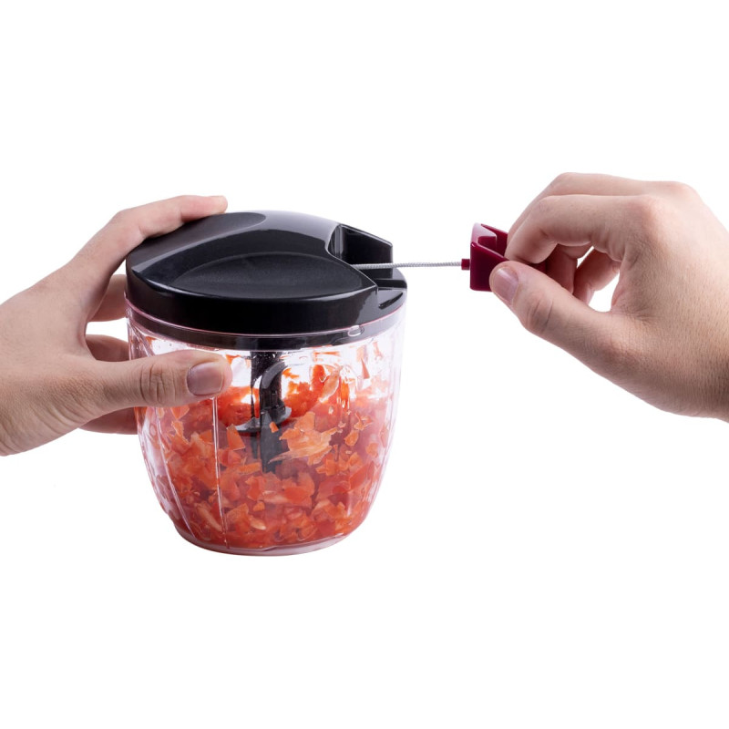 Manuālais vilces mehānisms. 2 maināmi piederumi. Nerūsējošā tērauda asmens ar 4 griešanas augstumiem; Lai sasmalcinātu visu veidu pārtiku, ķiplokus, sīpolus. Lāpstiņa saputošanai, sajaukšanai un emulģēšanai; mērču, krējumu un garšvielu pagatavošanai. Vāks, lai ēdiens būtu svaigs. Pastiprināta īpaši izturīga tvertne. Diametrs: 12,5 cm. Augstums: 14 cm Nesatur BPA. FDA un LFGB atbilstība. Tilpums: 900 ml. Neslīdoša pamatne.