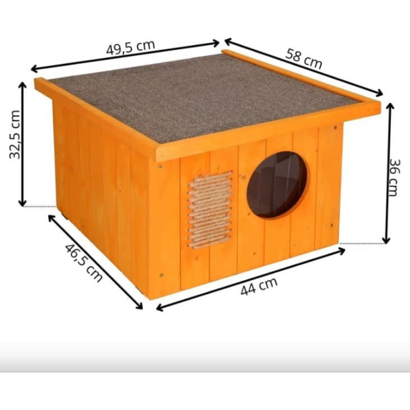 Tehniskie parametri: Kopējais platums: 49,5 cm Kopējais dziļums: 58 cm Priekšējā / aizmugurējā jumta augstums: 36 cm / 32,5 cm Grīdas iekšējie izmēri: 37x40 cm Ieejas diametrs: 15 cm Sienas biezums: 3,5 cm Materiāls: impregnēts koks, skaidu plātne