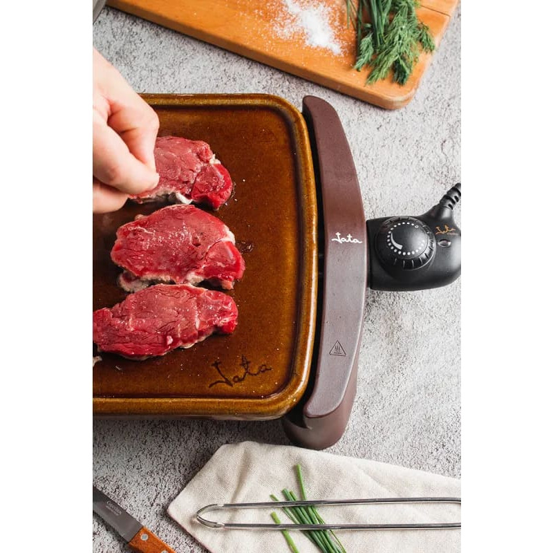 Terakotas grila gatavošana augstā temperatūrā. Ārkārtīga cietība. Roku darbs Spānijā. Nemainīgs lietošanā un laika gaitā. Tajā gatavo visu veidu gaļu un zivis. Unikāla un dabiska garša. Virsma 460 x 280 mm. Noņemams termostats ar regulējamu temperatūru. Auksta pieskāriena rokturi. Pārnēsājams uz galdu. Viegli tīrāms. Spriegums: 230 V Jauda: 1600 W