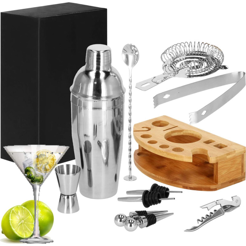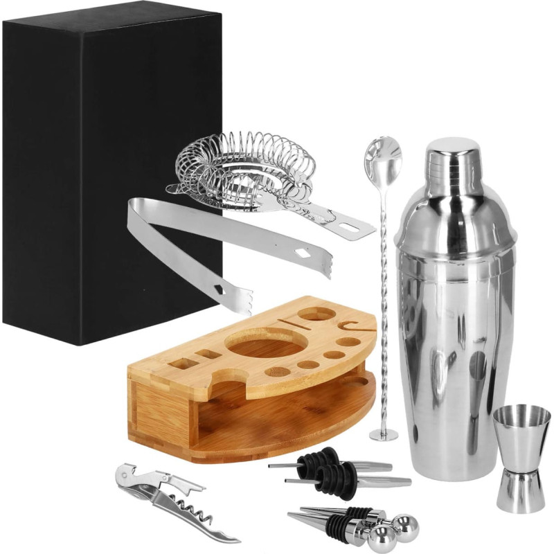 Priekšrocības: Moderns dizains: nerūsējošais tērauds ar bambusa statīvu. Universāls pielietojums: piemērots gan profesionāļiem, gan iesācējiem. Kompakts: pateicoties statīvam, neaizņem daudz vietas. Komplektā ietilpst: 1x trīsdaļīgs šeikeris 750 ml 1x kokteiļu filtrs 1x mērglāze – Jigger 15/30 ml 1x kokteiļu karote 1x ledus standziņas 1x stampiņš – Muddler 2x dozatori 2x pudeļu korķi 1x viesmīļa korķviļķis 1x statīvs piederumiem Parametri: Zīmols: Springos® Materiāls: nerūsējošais tērauds Krāsa: sudraba Komplektā: 12 gab. Drošs saskarei ar pārtiku Izmēri: Šeikeris: augstums 25 cm Kokteiļu filtrs: augstums 15 cm / platums 9 cm Mērglāze: augstums 6,5 cm / diametrs 4 cm un 3,5 cm Kokteiļu karote: garums 26 cm Ledus standziņas: garums 17 cm Stampiņš: garums 21 cm / diametrs 3,5 cm Dozators: garums 11 cm Pudeļu korķis: garums 9 cm Korķviļķis: garums 12 cm Statīvs: garums 24 cm / platums 13,5 cm / augstums 7 cm