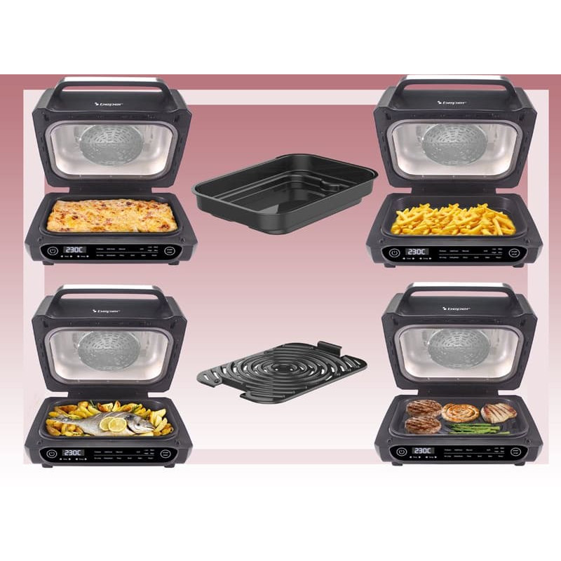 Cepšana bez eļļas: izmanto liela ātruma karstā gaisa cirkulāciju veselīgākai cepšanai. 8 gatavošanas programmas: gaisa kraukšķināšana, cepšana, grils (4 līmeņi), dehidrēšana, cepšana, pica un manuālais režīms. Regulējami iestatījumi: Temperatūra līdz 230°C; taimeris līdz 120 minūtēm (cepšana) un 24 stundām (žāvēšana). Uzsildīšanas funkcija: nodrošina optimālus gatavošanas rezultātus ar "Add Food" akustisko signālu. Digitālais vadības panelis: LED displejs precīzai darbībai. Vienkārša apkope: noņemams pretšļakatu režģis; nepiedegoša panna un režģis; komplektā iekļauta dubultā tīrīšanas birste. Drošības līdzekļi: Automātiska izslēgšanās ar skaņas signālu gatavošanas beigās.