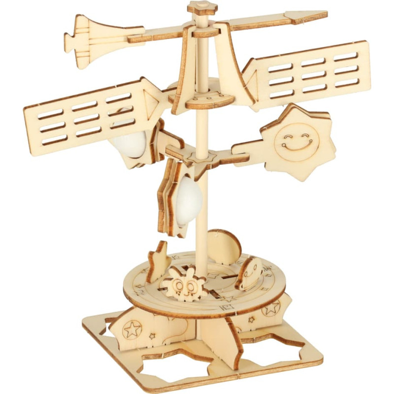 Komplektā ir precīzi izgrieztas koka detaļas, kuras bērns soli pa solim saliek, lai izveidotu reālistisku vējrādītāju. Katra detaļa perfekti iekļaujas pārējās detaļās, lai to varētu ērti salikt bez līmes. Trīs krāsaini marķieri ļauj bērnam izrotāt ar rokām veidoto vējrādītāju.