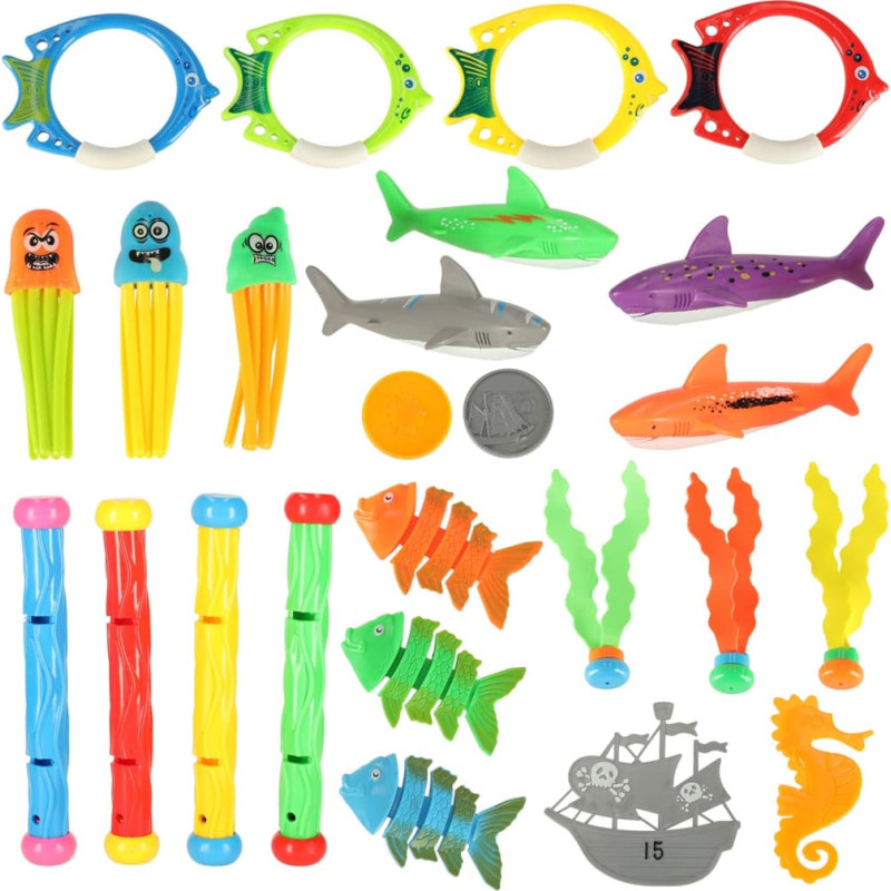Novietotas baseinā, zivis, jūras zirdziņi un astoņkāji ir daļa no rotaļu aktivitātēm, kurās bērns var attīstīt veiklību un motoriku. Komplektā ietilpst niršanas caurulītes, lai palīdzētu bērnam izvilkt rotaļlietas no ūdens.