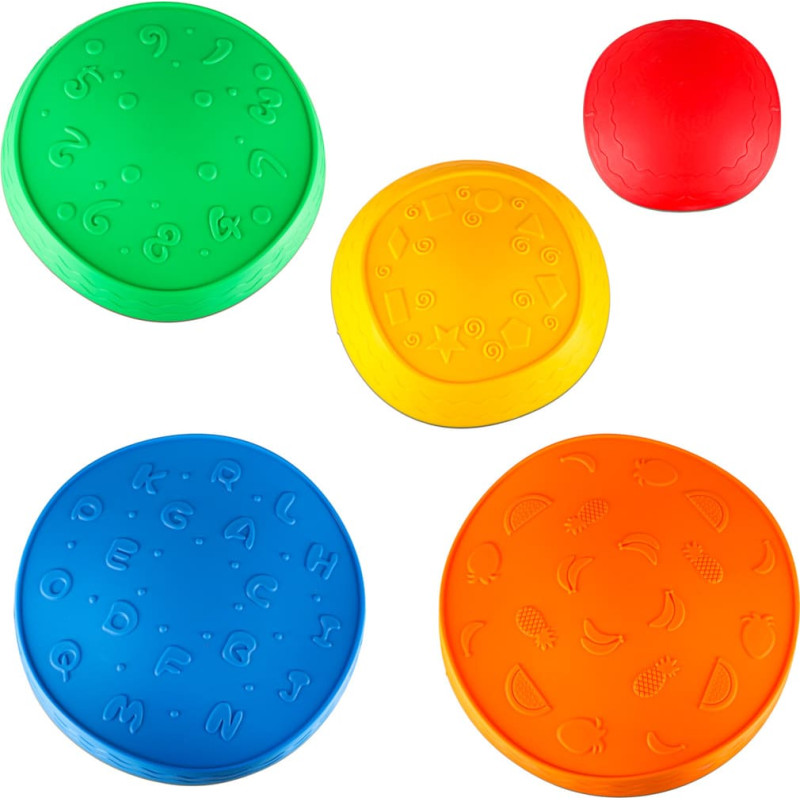 Tehniskās specifikācijas: - Vecums: 3+ - Plastmasa: poliuretāns - Krāsas: krāsu sajaukums (zila, dzeltena, sarkana, oranža, zaļa) - Gabaliņu skaits: 5 - Maksimālā slodze: 75 kg - pretslīdoša virsma: Jā