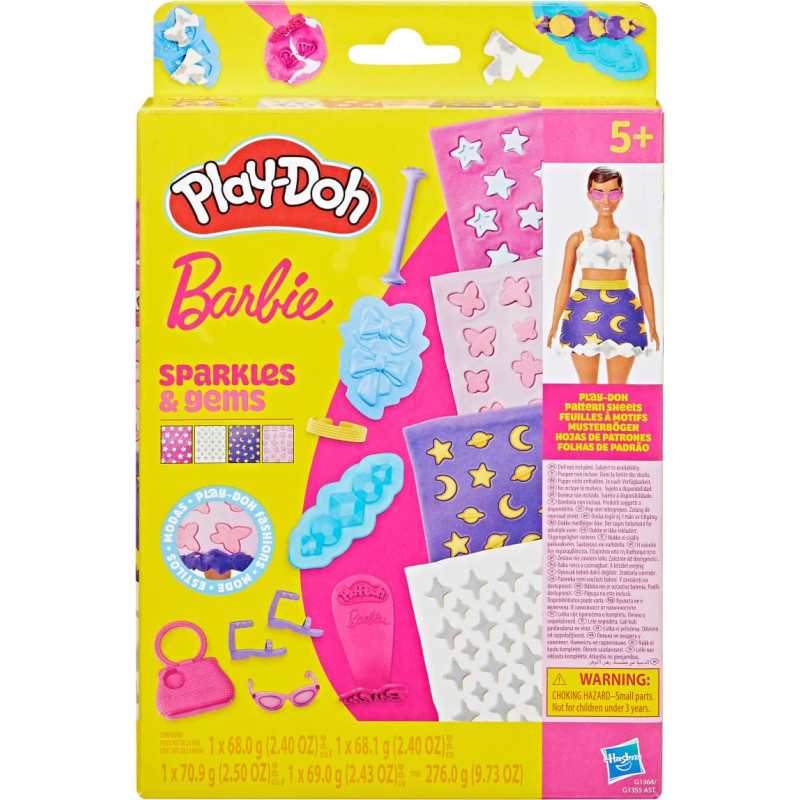 Radi vēl satriecošākus tērpus ar Play-Doh Barbie ap´g´erba dizaina komplektu! Šis mākslas un rokdarbu komplekts ir lielisks papildinājums jebkuram Play-Doh Barbie leļļu komplektam (nopērkams atsevišķi). 4 Play-Doh rakstu lapas ar jautrām krāsām un dizainiem palīdz bērniem veidot Barbie drēbes no Play-Doh masas. Pielāgo un papildini katru izskatu ar tādiem aksesuāriem kā sandales, somiņa, brilles un Play-Doh bantītes. Meklē lielisku Barbie dāvanu bērniem no 5 gadu vecuma? Šis Play-Doh komplekts ir ideāls veids, kā iedvesmot bērnus radošām aktivitātēm un iztēles spēlēm!