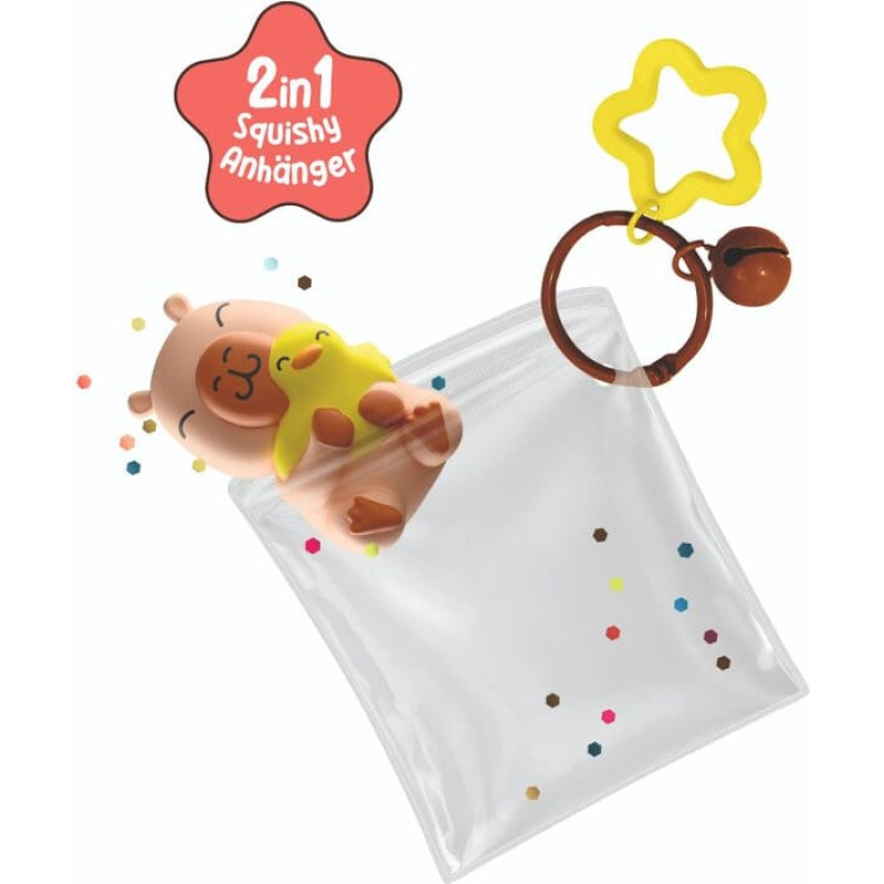 Šī mīkstā kapibara ir ideāli piemērota spaidīšanai un mīcīšanai – ar nomierinošu anti-stresa efektu! Ar atslēgu riņķi, mīlīgu zvaigznes piekariņu un mazu zvaniņu – lieliski piemērota somām, mugursomām vai kā jauka dāvaniņa! Iepakota ērtā maciņā ar rāvējslēdzēju un papildināta ar krāsainu konfeti vēl jautrākām rotaļām! Kapibaras izmērs aptuveni 2.4 x 1.5 x 4.0 cm. Uzmanību! Cena norādīta par 1 rotaļlietu. Pieejami 4 dažādi dizaini. Daži no attēlā redzamajiem dizainiem var būt izpārdoti. Brīdinājums! Šī nav rotaļlieta! Nav piemērots bērniem līdz 3 gadu vecumam, satur sīkas detaļas, pastāv aizrīšanās risks.