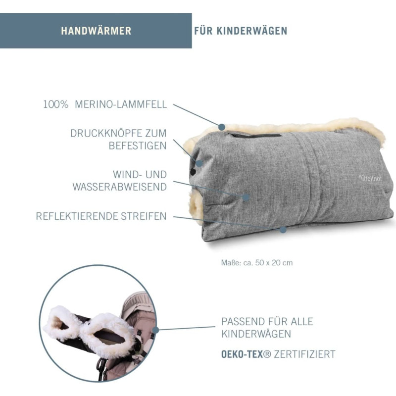 Roku sildītājs ar aitas vilnu – silts un ērts risinājums pastaigām Vairs nekādu neērtu cimdu uzvilkšanas un novilkšanas! Šis praktiskais aitas vilnas roku sildītājs pasargās jūsu rokas no aukstuma, vēja un mitruma. Tas viegli piestiprinās pie ratiņiem ar spiedpogām un droši turas vietā pastaigu laikā.Oderējums no merino vilnas sniedz dabisku siltumu, elpojamību un komfortu, savukārt izturīgais vēju un ūdeni atgrūdošais virsmateriāls nodrošina aizsardzību pret laikapstākļiem. Atstarojošās svītras palielina drošību, kad ir slikta redzamība vai tumsa.Īpašības:Oderējums: 100% merino aitas vilnaVējizturīgs un ūdens atgrūdošs ārējais materiālsOEKO-TEX® Standard 100 sertifikātsUniversāls izmērs, der visiem ratiņu modeļiemViegla piestiprināšana ar spiedpogāmAtstarojošās svītras drošībaiIzturīgs un viegli kopjamsIevērot kopšanas instrukcijas mazgājot