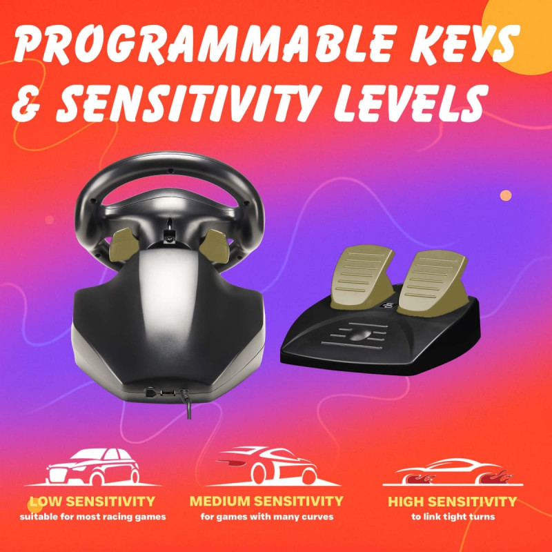 Stūre arkādes spēlēm, atklāj pirmās sacīkšu simulācijas sajūtas.   Funkcijas • Vairāku saderīgu 3 spieķu vadu stūre • Rotācijas leņķis: 180 grādi. • Stūres diametrs: 22 cm. • Pedāļi un stūre. • Dubultās vibrācijas motors • Savietojamība: PS4, PS3, XBOX ONE, personālais dators, SWITCH