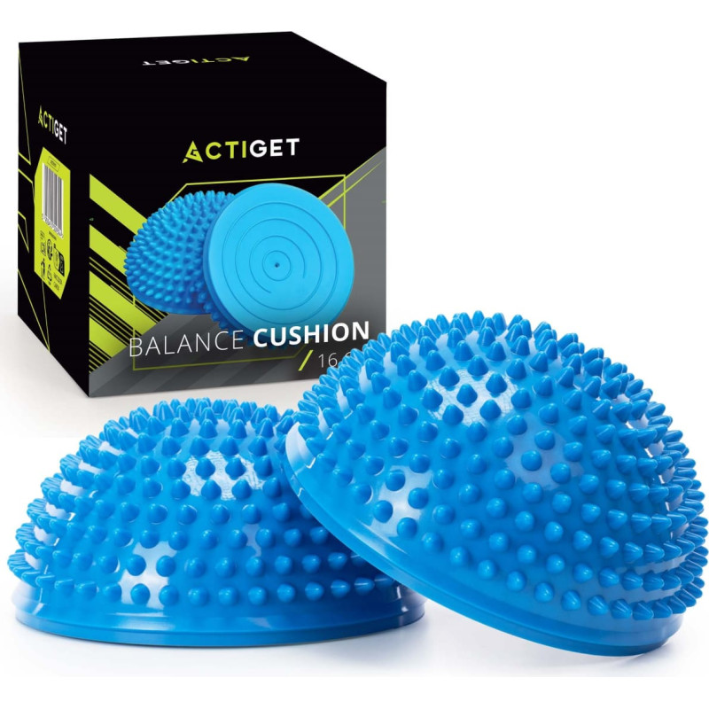 Zīmols: Actiget® Sērija: universālā sērija Materiāls: PVC Krāsa: zila Svars: 270 g Maksimālā slodze: 100 kg Neslīdoša virsma Komplektā ietilpst: 2 x sensorās pusbumbas Izmēri: Diametrs: 16 cm Augstums: 9 cm Papildu informācija: Produktam ir Actiget® logotips Spilvenam ir 1 virsmas veids: masējoša un stimulējoša virsma ar gariem izciļņiem