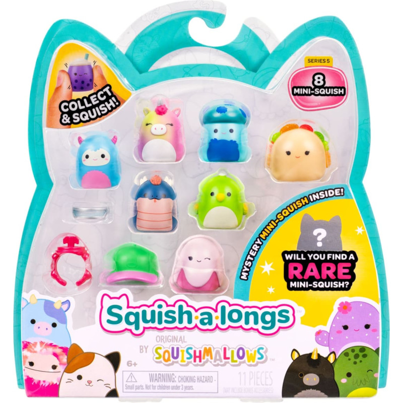 Esiet gatavi jaunam spaidīšanas līmenim ar Squish-a-longs, kas ir Squishmallows ģimenes jaunākais papildinājums! Burvīgajām un pārnēsājamām, kolekcionējamām Squish-a-longs Mini-Squish figūriņām, kas izgatavotas no patīkami spaidāmas plastmasas, ir ideāls 2,5 cm izmērs! Jautrība nekad nebeigsies, jo ir vairāk nekā 140 mini-squish figūriņu, ko varat vākt, mainīt, valkāt, izrādīt un spēlēties! Izceliet savu stilu, valkājot gredzenu un sapucējot savu Mini-Squish figūriņu ar jautriem aksesuāriem, piemēram, sirds formas brillēm, cepurēm, miega maskām un daudz ko citu. Tikt pie visām šīm rotaļlietām jums palīdzēs noderīgā kolekcionāra pamācība. Baudiet jautrību ar Squish — sāciet savu Mini-Squish kolekciju jau šodien!