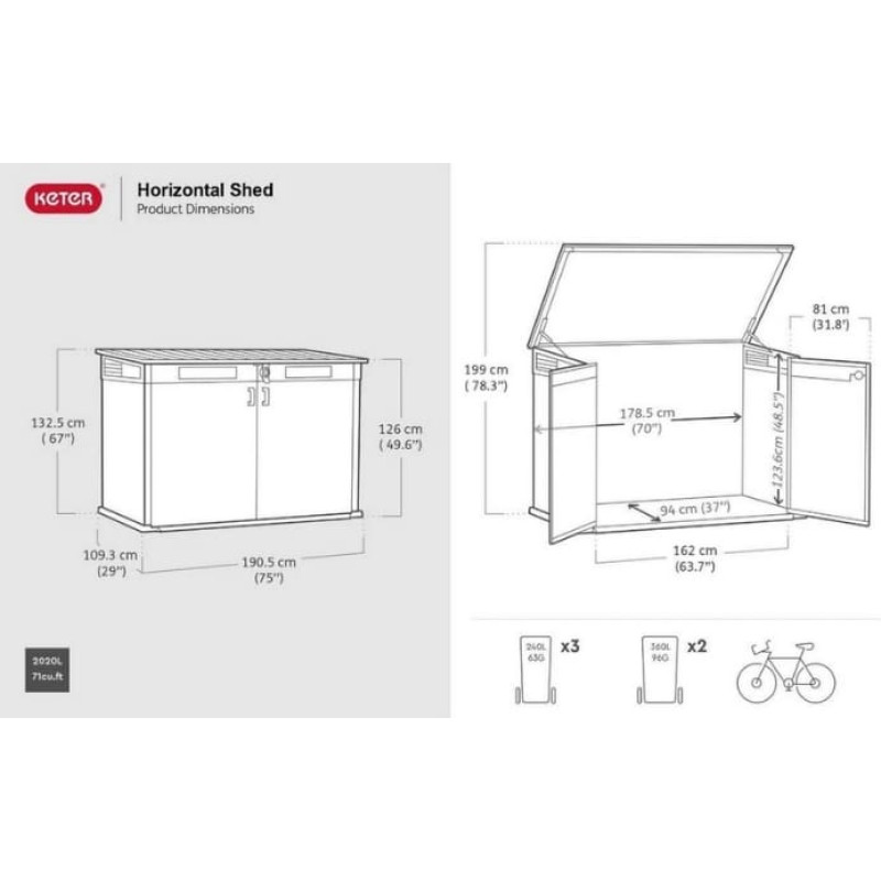 Uzglabāšanas šķūnītis ir izgatavota, izmantojot inovatīvu DecoCoat™ tehnoloģiju, kas ir izturīga pret laikapstākļiem. Tā nerūsē, neveido ieliekumus un nelobās. Šī ārkārtīgi modernais un izturīgais uzglabāšanas šķūnītis neprasa apkopi un ir viegli saliekams. Lai nodrošinātu maksimālu ērtību, tai ir slieksnis ērtai manevrēšanai. Hidrauliskie virzuļi un pret rūsu izturīgas metāla eņģes ar 180° atvēršanas leņķi nodrošina ērtu atvēršanu. Turklāt regulējami kronšteini plauktu uzstādīšanai ļauj pielāgot uzglabāšanas iespējas. Slēdzamas durvis nodrošina papildu drošību, un iebūvētā ventilācijas sistēma novērš nepatīkamu smaku uzkrāšanos. Tajā ir arī spraugas diviem 240 litru konteineriem vai trim 360 litru konteineriem. Ārējie izmēri (cm): 190 x 109 x 132,5 Iepakojuma izmēri (cm): 112 x 132 x 28 Neto svars (kg): 61,30