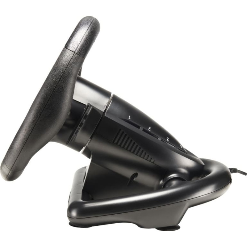 Sacīkšu stūre, kas paredzēta sacīkšu simulācijai un piedāvā patiesas sacīkšu sajūtas.   Funkcijas • Rotācijas leņķis: 180 grādi • Stūres diametrs: 23 cm • Stūres lāpstiņas un pedāļi • 3 jutības līmeņi • Gumijas satvēriens   Tehniskie dati Rotācijas leņķis: 180 grādi Stūres diametrs: 23 cm Satvēriena apdare: jā Pārnesumu pārslēgšanas lāpstiņas: Jā Pārnesumu svira: Nē Pedāļi komplektā: Jā Pedāļu skaits: 2 : gāzes pedālis + bremze Pedāļu tips: mazi Vibrācija: - Saderība ar austiņām: - Piederums: - Saderība ar kabīni: - Saderība ar OS: PS4, PS3, XBOX ONE, XBOX sērija X/S, dators, SWITCH